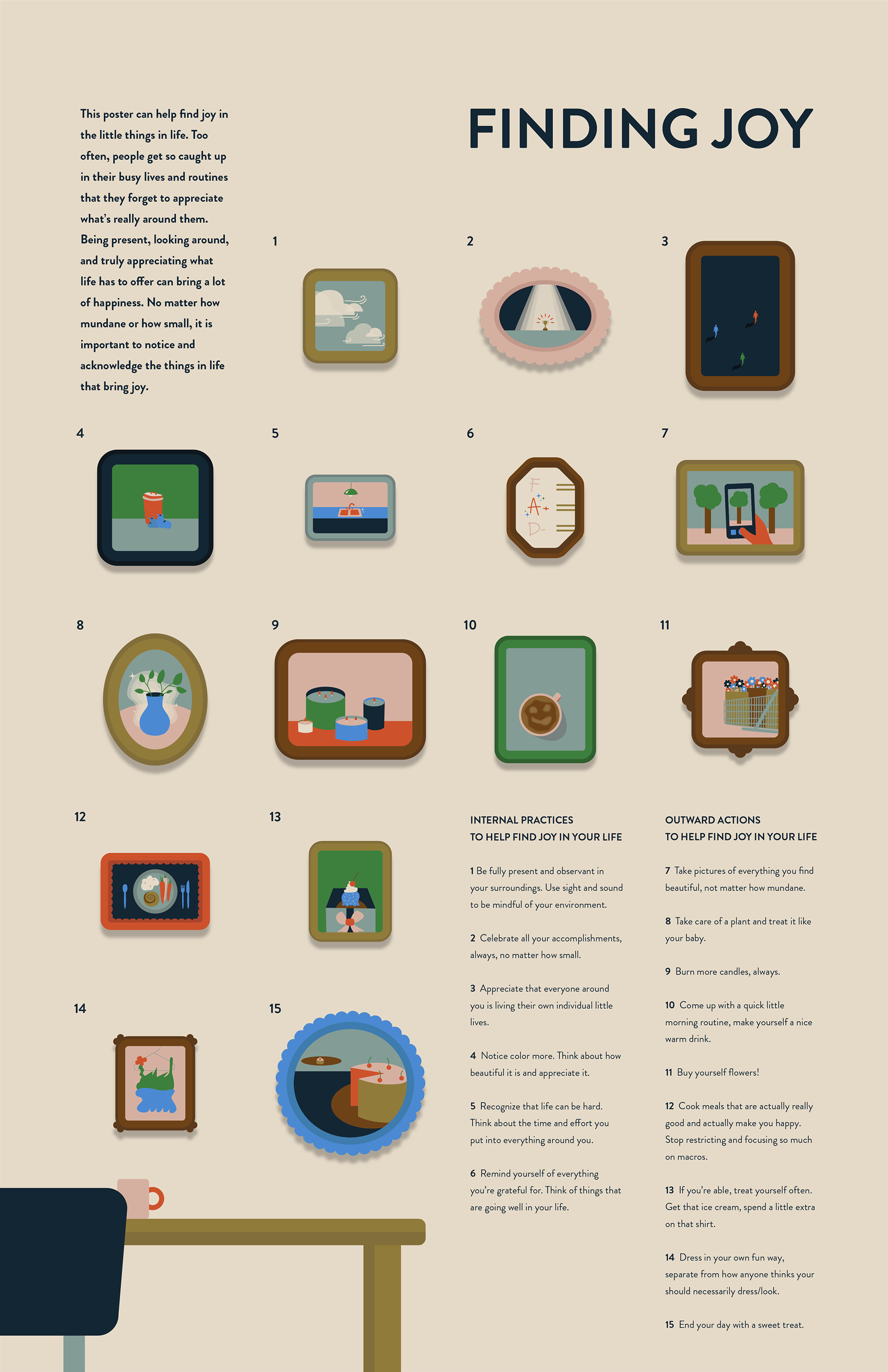 This poster was created for a project that was meant to teach viewers anything at all. I chose finding joy in the little things in life. People say this all the time, but what are examples and what does it really mean? In addition to a short description, I created these little picture frame-esque illustrations to represent different ways that I find joy in the little things. With a lighthearted color palette, each picture is not only fun to look at, but it also has meaning.